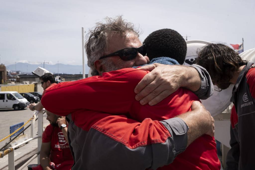 Il momento dello sbarco: Flavio abbraccia una persona ospitata sulla Life Support dal soccorso all’arrivo al POS assegnato.